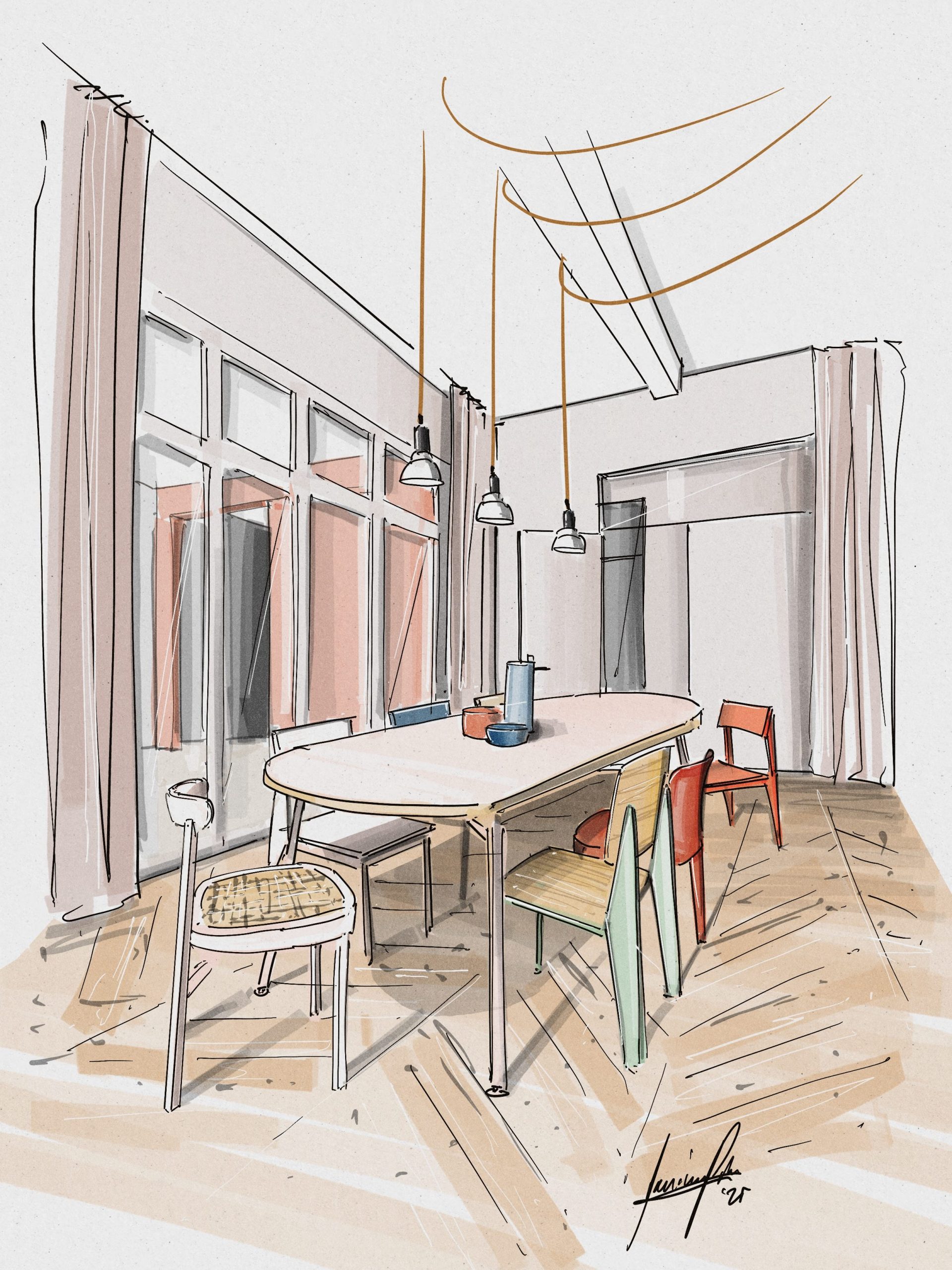 Ausdrucksstarke Skizzen für Innenräume – ideal für Entwurfsphasen und Kundenpräsentationen.